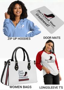 DON’T CHEAT YOUR GREATNESS(R) reminds you what you’re made of during tough financial times, unwanted negative news disappointing career opportunities, and unexpected personal issues. DON’T CHEAT YOUR GREATNESS(R) is, Inspirational fashion, Confidence boosters, Positive vibes clothing, Goal-driven gear, Success mindset merch, Uplifting attire, and Self-improvement styles, with Motivational messages. Shop for you, a friend, family member, co-worker, or love one.